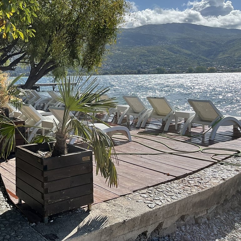 We'd heard about the Lake Ohrid Boardwalk, but as yet, we had not seen it. It turns out that as you walk through old town Ohrid, you have to turn left at Ilindenska. This just looks like an alley between two buildings, which is why we had ignored it on our previous walk. Actually, it's a street.