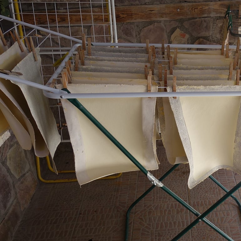 The little workshop makes paper by hand, using traditional methods from the 16th century. There are no power tools in sight. Watery pulp is scooped up using a rectangular sieve and pressed to remove water and to compress the pulp into a sheet of paper. The wet sheets of paper are then hung to dry in the sun. Koro was amazed at how closely this traditional process was to the highly automated processes used in modern paper mills. The basic steps are the same.