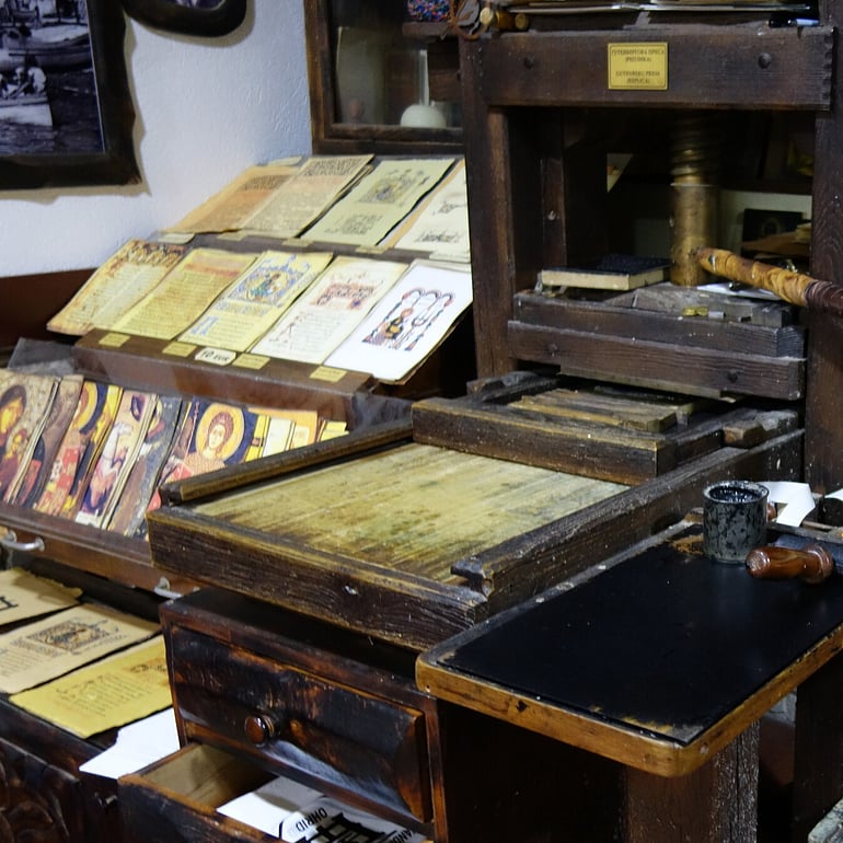 Sitting by the pulp tank was an old Gutenberg printing press. The workshop still uses the Gutenberg press. The shop is filled with pictures and documents for sale. They've all been printed using the Gutenberg press using paper that has been made onsite.